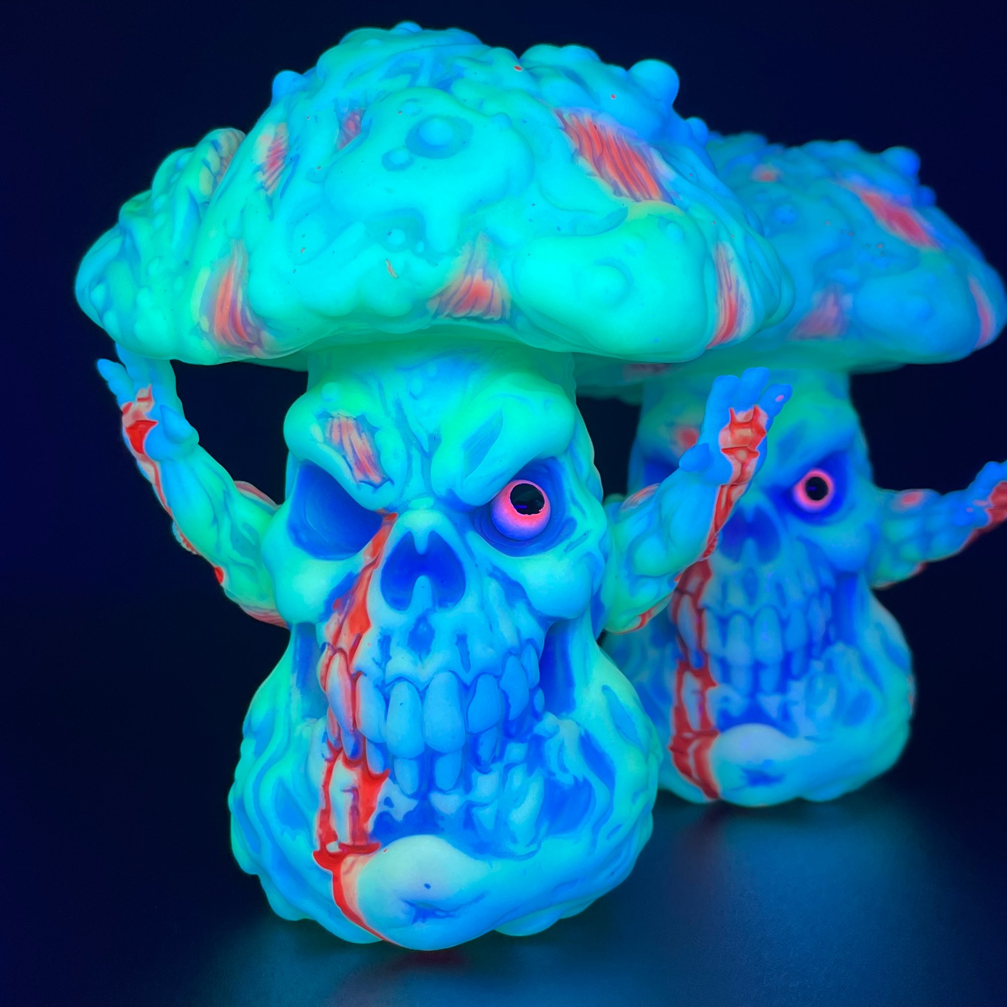 Apparition Fungusting LE4 is hand painted with sprays on glow vinyl in a range of purple and blue fluorescent Vinyl Wonder toy paint with red details, blood drip and an acrylic doll eye.