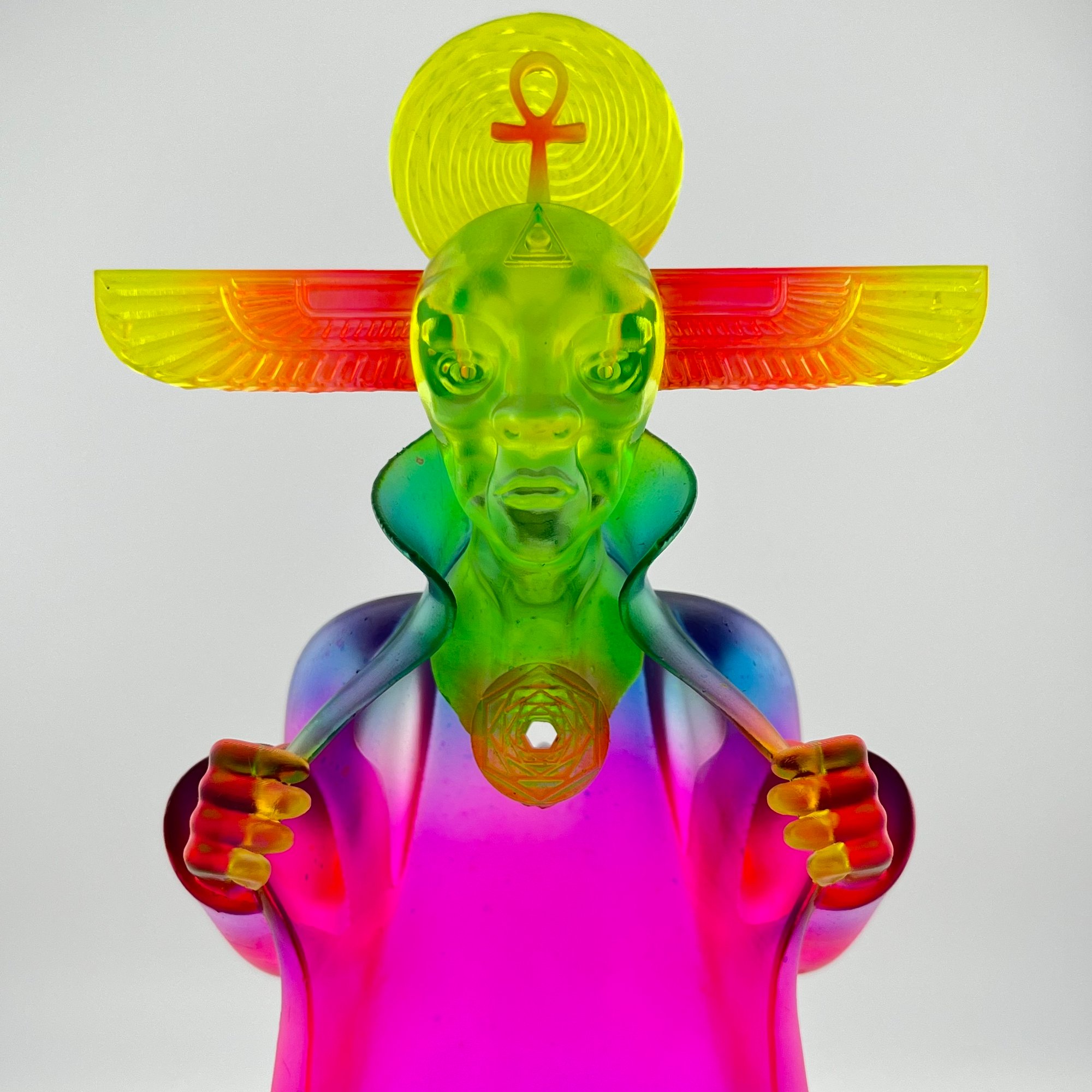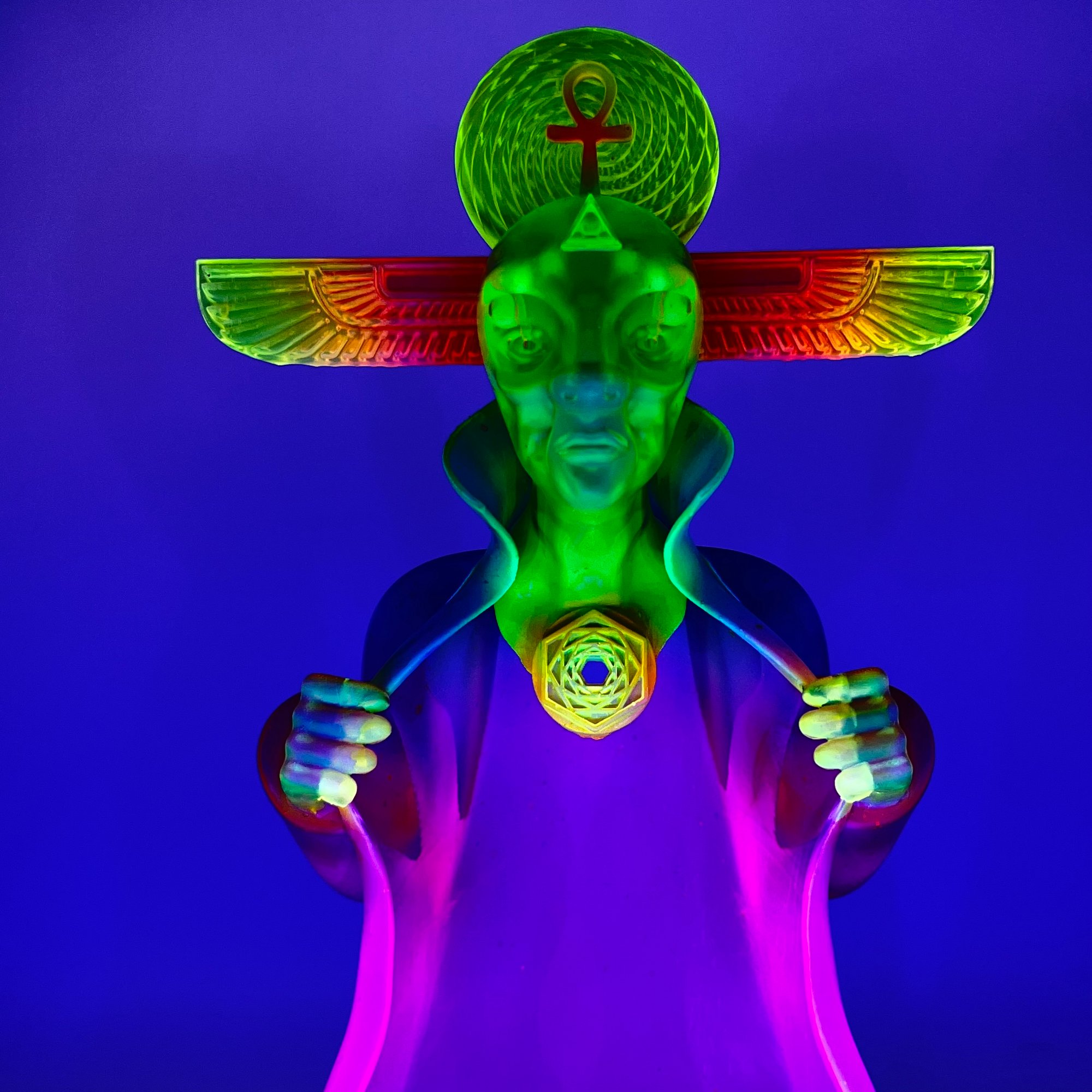 This solar priest is a 3D printed 1/1 prototype test. This clear working prototype statuette shows where the sun will shine through the light wells on the autumn equinox at noon in the NW United states. This tested to see if the sun will illuminate the eyes, medallion and project a heart shape in front of it. The statue needs to be pointed 327° to the NW in Oregon or Washington to ensure the alignment is correct. The clear material was intended to verify the proper positioning, and will probably negate the light wells as the material will pass light through the entire form.